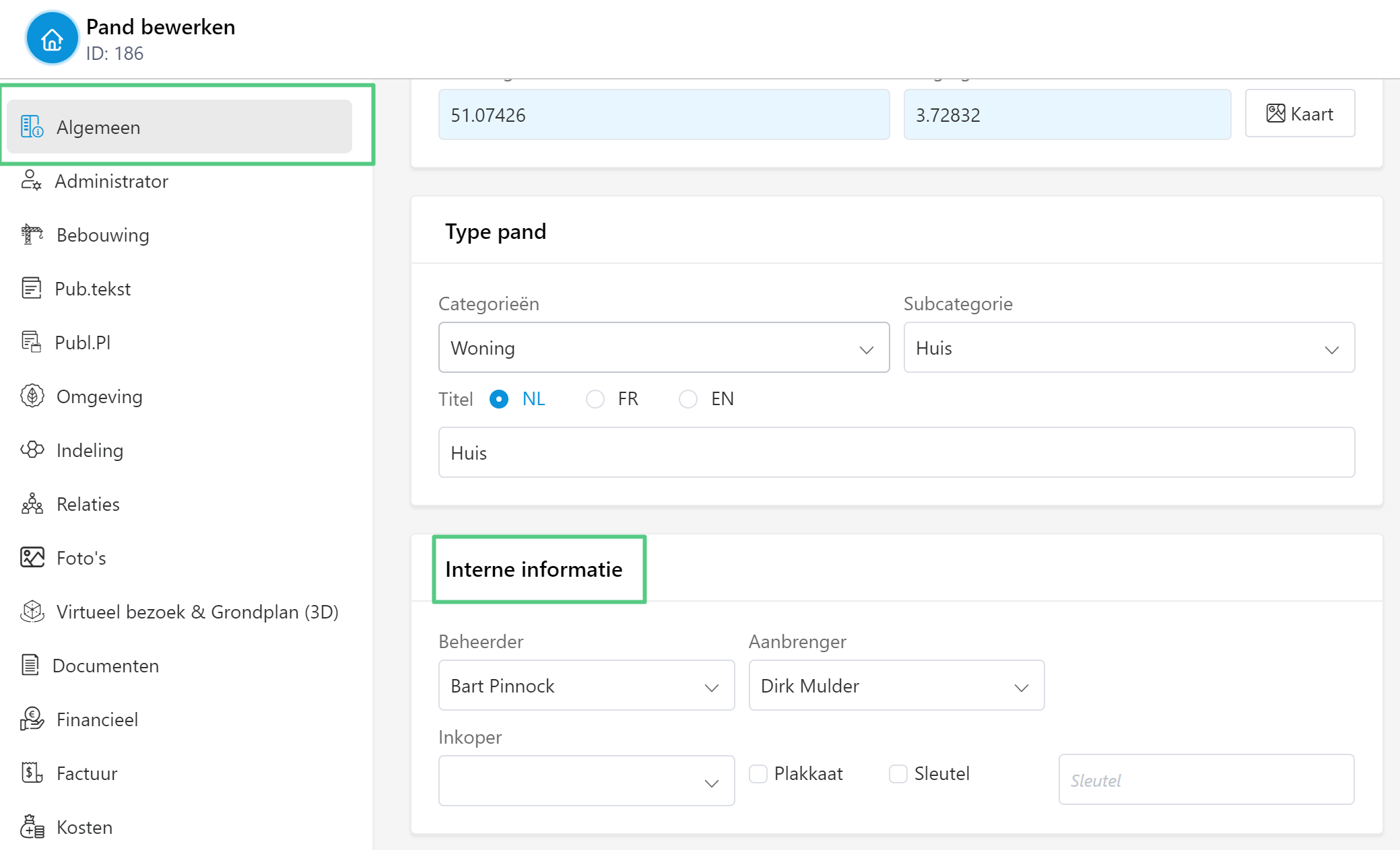 De contactgegevens van de publicatie zijn gelink met de beheerder gegevens in Omnicasa. Deze kunnen ingesteld worden bij het onderdeel Interne Informatie onder de het nagivatie-element Algemeen. Hieronder is aangeduid waar deze informatie kan teruggevonden worden in de web-versie.