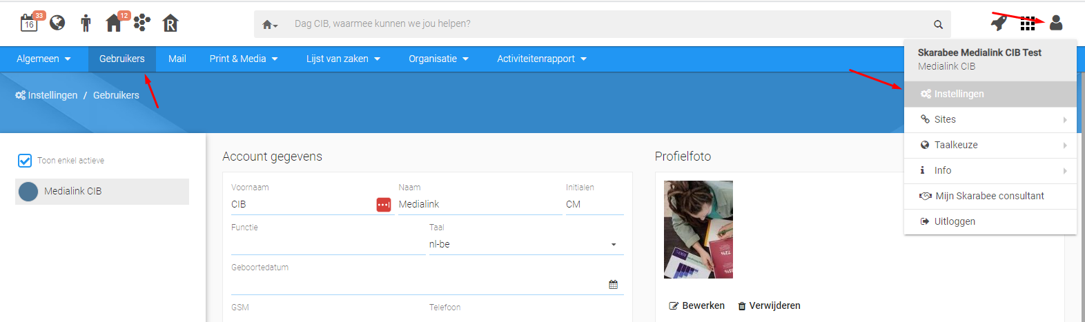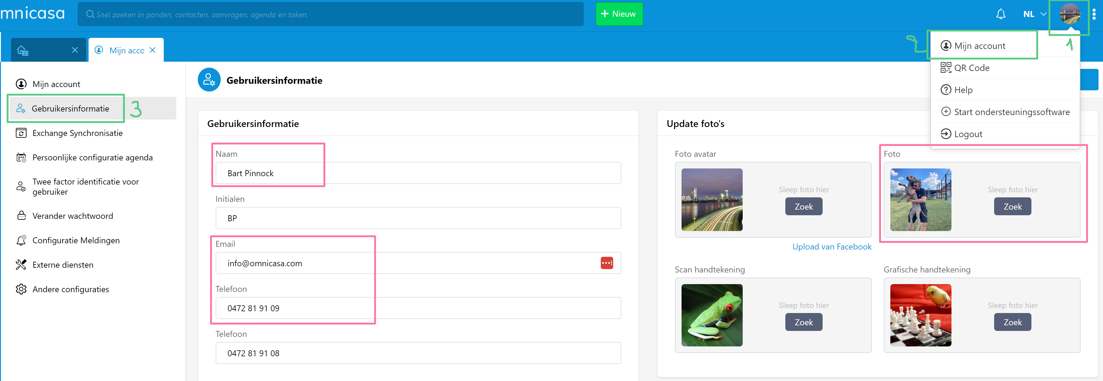 De gegevens van het profiel kunnen ingesteld worden via de account gegevens. Deze kunnen gevonden worden on de gebruikersinstellingen. Zie ook de screenshot hieronder. Uit het profiel worden de Voornaam, Naam, Email en Telefoon.