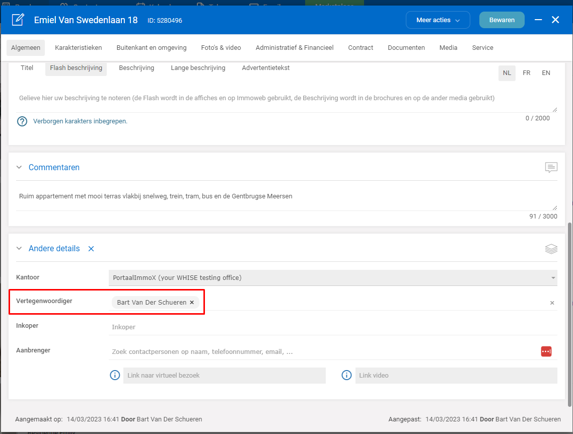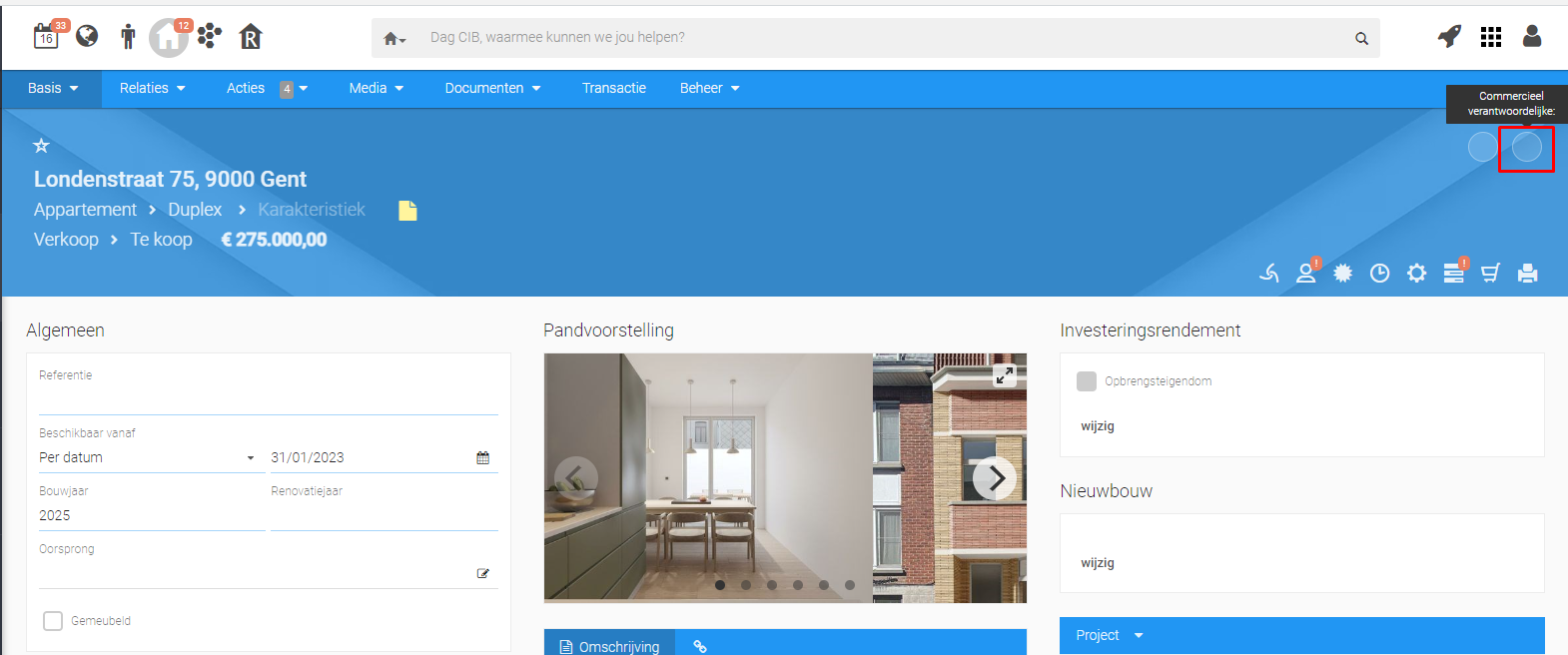 In Skarabee zijn de contactgegevens gelinkt aan de commercieel verantwoordelijke van een pand. Deze zijn rechtsboven op een pand in te stellen.