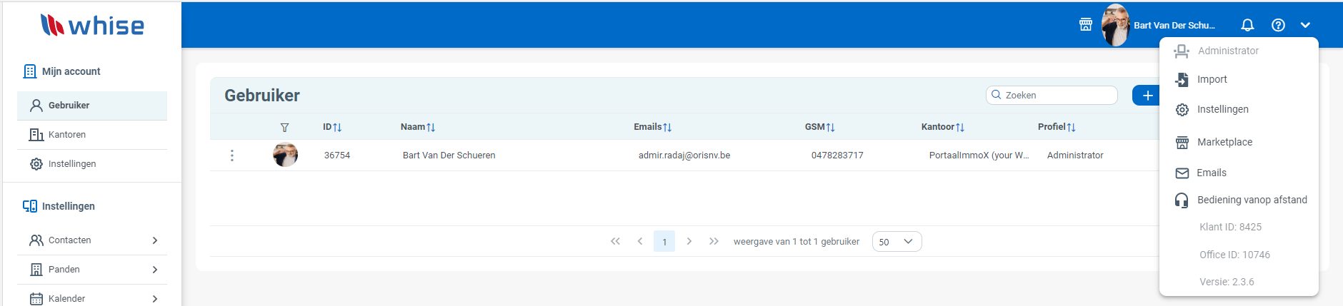 Bij Whise worden de contacgegevens van de vertegenwoordiger gebruikt. Deze is in te stellen in de tab Algemeen. Hieronder kan je zien waar dit is.