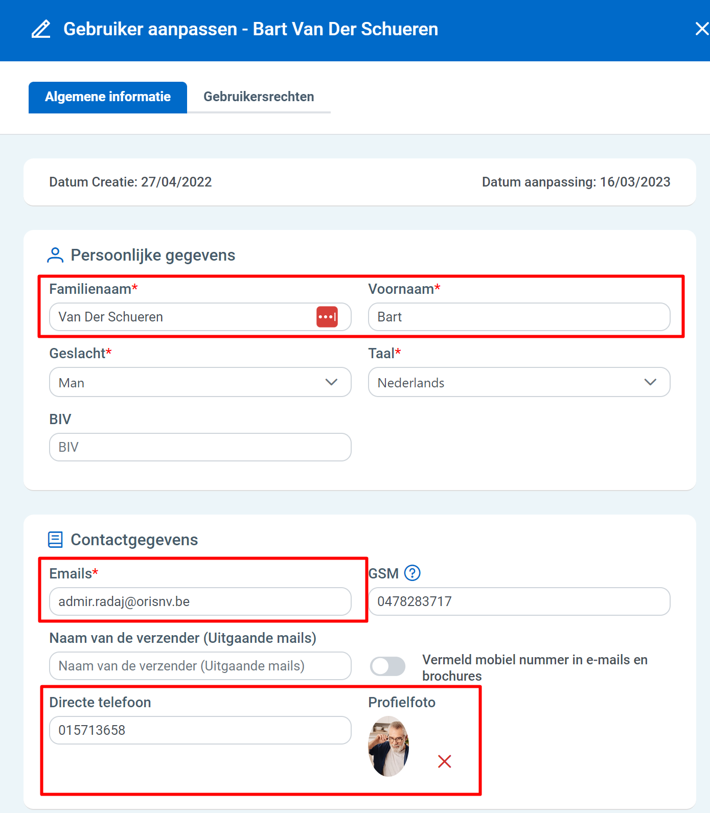 De contactgegevens van iedereen kunnen het snelst worden aangepast door de admin in het admin panel.